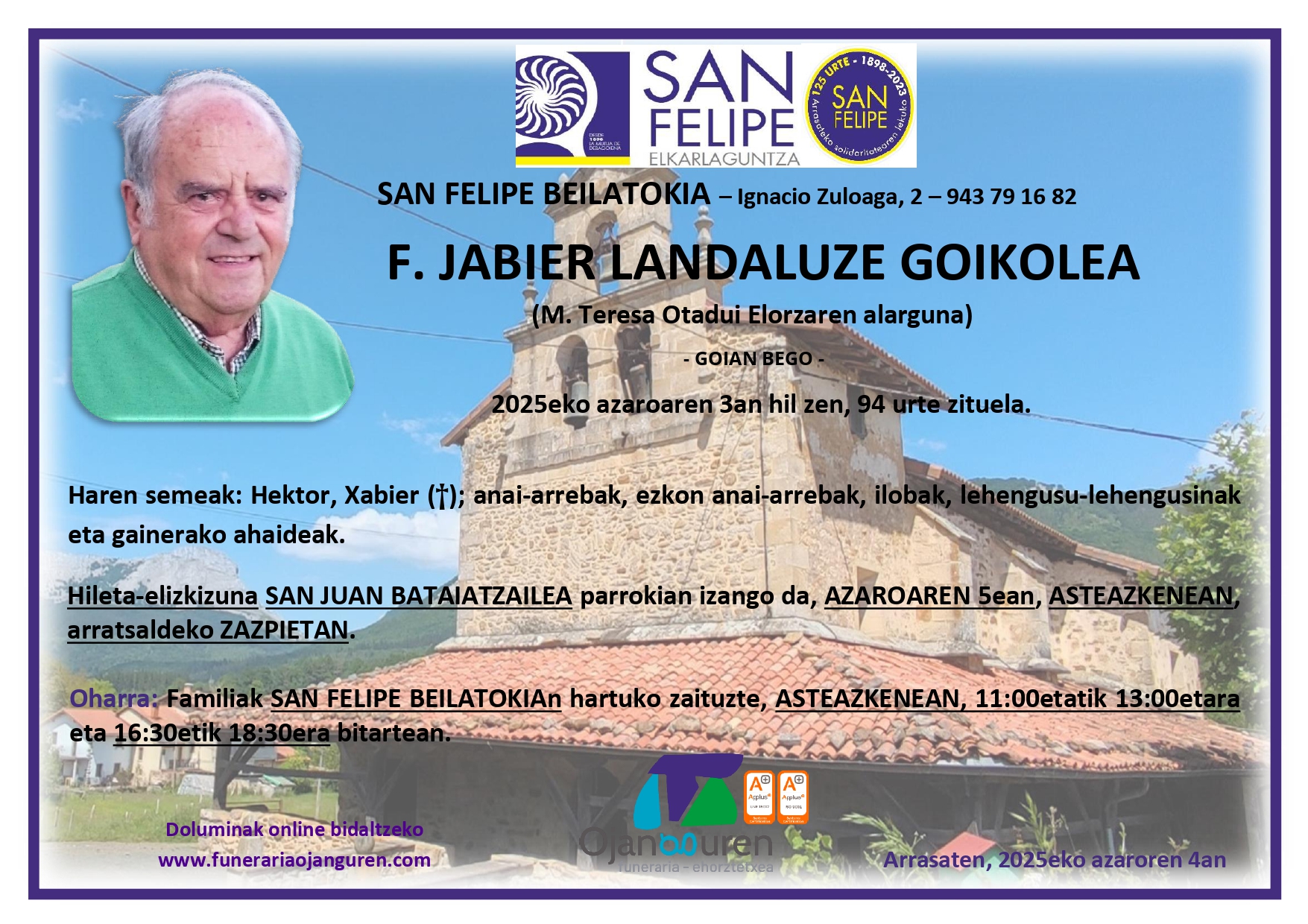 F. JABIER LANDALUZE GOIKOLEA (M. Teresa Otadui Elorzaren alarguna) -GOIAN BEGO- 2025eko azaroaren 3an hil zen, 94 urte zituela. Haren semeak: Hektor, Xabier (†); anai-arrebak, ezkon anai-arrebak, ilobak, lehengusu-lehengusinak eta gainerako ahaideak. Hileta-elizkizuna SAN JUAN BATAIATZAILEA parrokian izango da, AZAROAREN 5ean, ASTEAZKENEAN, arratsaldeko ZAZPIETAN. Oharra: Familiak SAN FELIPE BEILATOKIAn hartuko zaituzte, ASTEAZKENEAN, 11:00etatik 13:00etara eta 16:30etik 18:30era bitartean. Arrasaten, 2025eko azaroren 4an