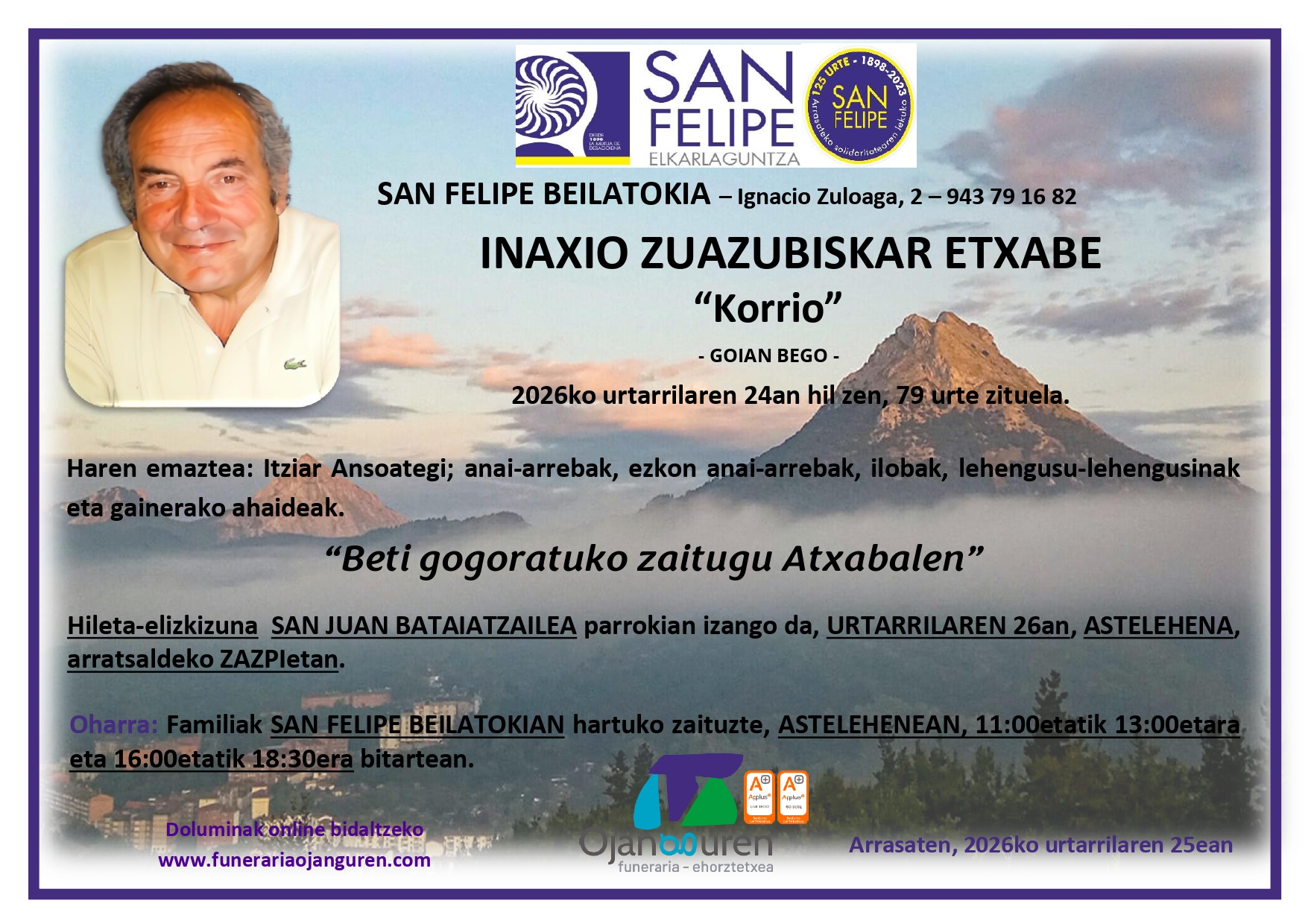 Inaxio Zuazubiskar Etxabe "Korrio" - Goian bego - Herenegun hil zen, 79 urte zituela, Elizakoak eta Aita Santuaren Bedeinkapena hartu ondoren. "Beti gogoratuko zaitugu Atxabalen" Haren emaztea: Itziar Ansoategi; anai-arrebak, ezkon anai-arrebak, ilobak, lehengusu-lehengusinak eta gainerako ahaideak. Haren arimaren alde otoitz bat eskatzen dizuete eta arren etor zaiteztela GAUR, ASTELEHENA, arratsaldeko ZAZPIETAN, SAN JUAN BATAIATZAILEA parroki elizan egingo den hiletara. Aldez aurretik mila esker. ARRASATEN, 2026ko urtarrilaren 26an Oharra: Familiak SAN FELIPE BEILATOKIAN hartuko zaituzte, gaur, ASTELEHENA, 11:00etatik 13:00etara eta 16:00etatik 18:30era bitartean.