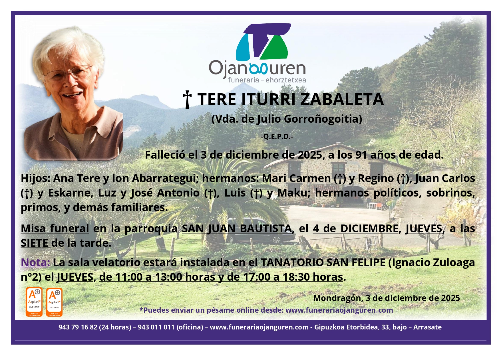 Tere Iturri Zabaleta (Vda. de Julio Gorroñogoitia) - GOIAN BEGO - Falleció ayer, a los 91 años de edad. Hijos: Ana Tere y Ion Abarrategui; hermanos: Mari Carmen (†) y Regino (†), Juan Carlos (†) y Eskarne, Luz y José Antonio (†), Luis (†) y Maku; hermanos políticos, sobrinos, primos, y demás familiares. Ruegan a sus amistades encomienden su alma a Dios y asistan a los funerales que se celebrarán HOY, JUEVES, a las SIETE de la tarde, en la iglesia parroquial de San Juan Bautista, por todo lo cual les quedarán muy agradecidos. MONDRAGÓN, 4 de deciembre de 2025 Nota: La sala velatorio estará instalada en el TANATORIO SAN FELIPE (Ignacio Zuloaga nº2) hoy, JUEVES, de 11:00 a 13:00 horas y de 17:00 a 18:30 horas.