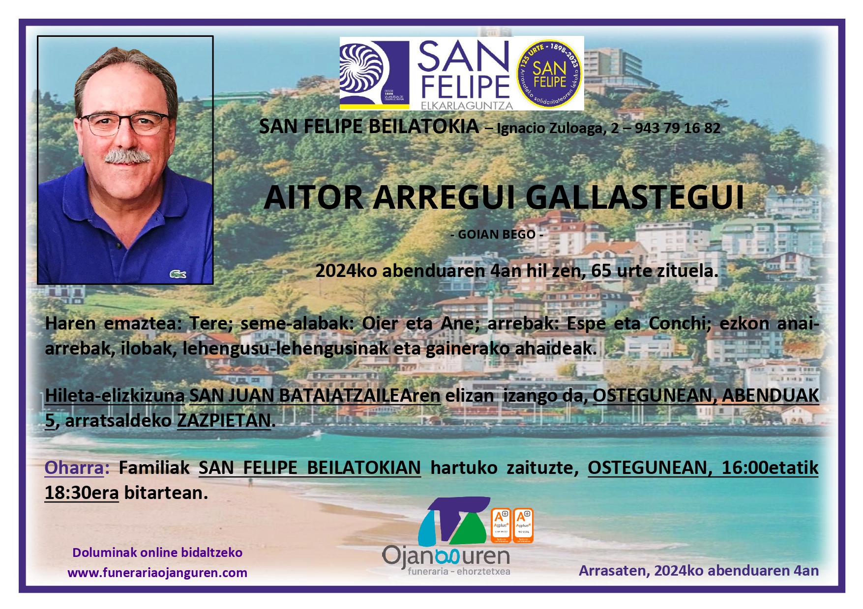 AITOR ARREGUI GALLASTEGUI -GOIAN BEGO- 2024ko abenduaren 4an hil zen, 65 urte zituela. Haren emaztea: Tere; seme-alabak: Oier eta Ane; arrebak: Espe eta Conchi; ezkon anai-arrebak, ilobak, lehengusu-lehengusinak eta gainerako ahaideak. Hileta-elizkizuna SAN JUAN BATAIATZAILEAren elizan izango da, OSTEGUNEAN, ABENDUAK 5, arratsaldeko ZAZPIETAN. Oharra: Familiak SAN FELIPE BEILATOKIAN hartuko zaituzte, OSTEGUNEAN, 16:00etatik 18:30era bitartean. Arrasaten, 2024ko abenduaren 4an