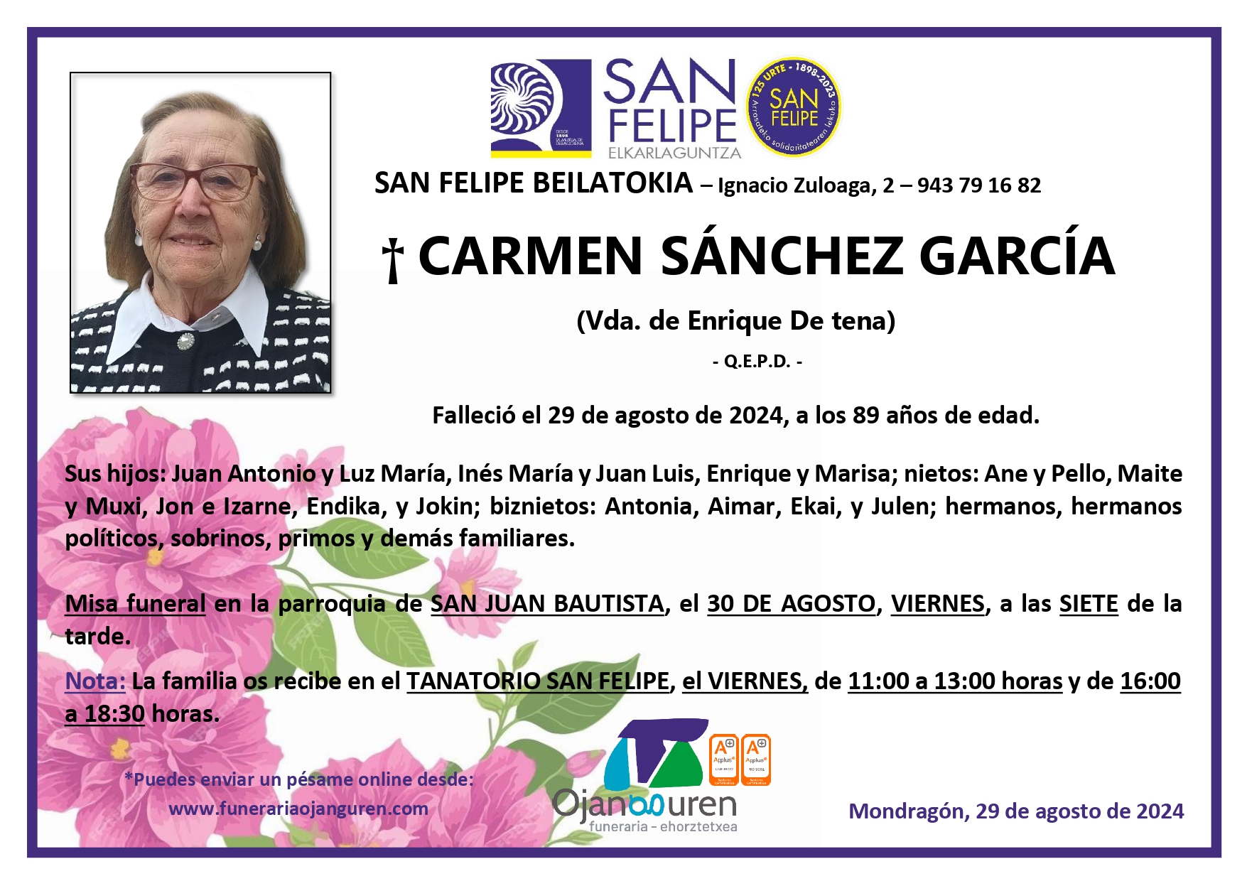 CARMEN SÁNCHEZ GARCÍA (Vda. de Enrique De tena) – Q.E.P.D. – Falleció el 29 de agosto de 2024, a los 89 años de edad. Sus hijos: Juan Antonio y Luz María, Inés María y Juan Luis, Enrique y Marisa; nietos: Ane y Pello, Maite y Muxi, Jon e Izarne, Endika, y Jokin; biznietos: Antonia, Aimar, Ekai, y Julen; hermanos, hermanos políticos, sobrinos, primos y demás familiares. Misa funeral en la parroquia de SAN JUAN BAUTISTA, el 30 DE AGOSTO, VIERNES, a las SIETE de la tarde. Nota: La familia os recibe en el TANATORIO SAN FELIPE, el VIERNES, de 11:00 a 13:00 horas y de 16:00 a 18:30 horas.