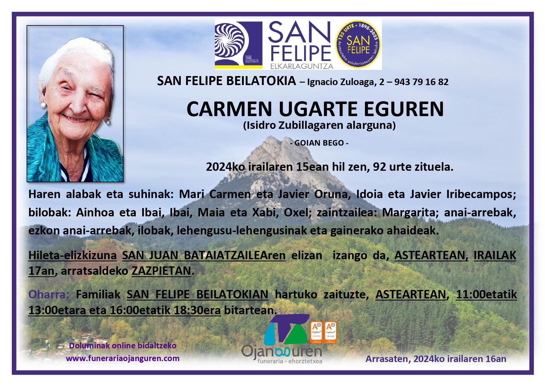 CARMEN UGARTE EGUREN (Isidro Zubillagaren alarguna) -GOIAN BEGO- 2024ko irailaren 15ean hil zen, 92 urte zituela. Haren alabak eta suhinak: Mari Carmen eta Javier Oruna, Idoia eta Javier Iribecampos; bilobak: Ainhoa eta Ibai, Ibai, Maia eta Xabi, Oxel; zaintzailea: Margarita; anai-arrebak, ezkon anai-arrebak, ilobak, lehengusu-lehengusinak eta gainerako ahaideak. Hileta-elizkizuna SAN JUAN BATAIATZAILEAren elizan izango da, ASTEARTEAN, IRAILAK 17an, arratsaldeko ZAZPIETAN. Oharra: Familiak SAN FELIPE BEILATOKIAN hartuko zaituzte, ASTEARTEAN, 11:00etatik 13:00etara eta 16:00etatik 18:30era bitartean. Arrasaten, 2024ko irailaren 16an