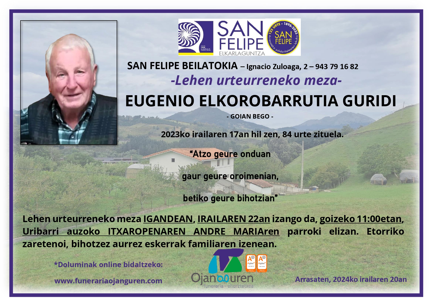 Eugenio Elkorobarrutia Guridi - Goian bego - Herenegun, Gasteizen hil zen, 84 urte zituela, Elizakoak eta Aita Santuaren Bedeinkapena hartu ondoren. Haren emaztea: Conchi Pérez; seme-alabak: Marini (†), Juan Mari eta Garbiñe Txintxurreta; bilobak: Iker eta Oier; anai-arrebak, ezkon anai-arrebak, ilobak, lehengusu-lehengusinak eta gainerako ahaideak. Haren animaren alde otoitz bat eskatzen dizuete eta arren etor zaiteztela GAUR, ASTEARTEA, arratsaldeko ZAZPIETAN, San Juan Bataiatzailearen parroki elizan egingo den hiletara. Aldez aurretik mila esker. ARRASATEN, 2023ko irailaren 19an Oharra: Familiak San Felipe beilatokian hartuko zaituzte, gaur, asteartea, 16:00etatik 18:30era bitartean.