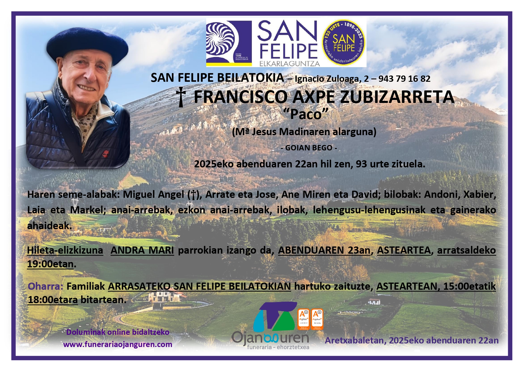 FRANCISCO AXPE ZUBIZARRETA “Paco” (Mª Jesus Madinaren alarguna) – GOIAN BEGO – 2025eko abenduaren 22an hil zen, 93 urte zituela. Haren seme-alabak: Miguel Angel (†), Arrate eta Jose, Ane Miren eta David; bilobak: Andoni, Xabier, Laia eta Markel; anai-arrebak, ezkon anai-arrebak, ilobak, lehengusu-lehengusinak eta gainerako ahaideak. Hileta-elizkizuna ANDRA MARI parrokian izango da, ABENDUAREN 23an, ASTEARTEA, arratsaldeko 19:00etan. Oharra: Familiak ARRASATEKO SAN FELIPE BEILATOKIAN hartuko zaituzte, ASTEARTEAN, 15:00etatik 18:00etara bitartean. Aretxabaletan, 2025eko abenduaren 22an