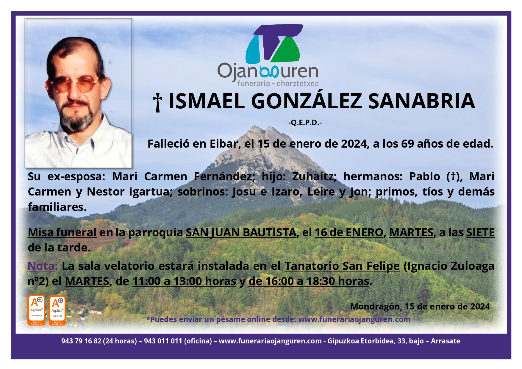 Ismael González Sanabria - Q.E.P.D. - Falleció ayer, en Eibar, a los 69 años de edad después de recibir los Santos Sacramentos y la Bendición Apostólica de Su Santidad. Su ex-esposa: Mari Carmen Fernández; hijo: Zuhaitz; hermanos: Pablo (†), Mari Carmen y Nestor Igartua; sobrinos: Josu e Izaro, Leire y Jon; primos, tíos y demás familiares. Ruegan a sus amistades encomienden su alma a Dios y asistan a los funerales que se celebrarán HOY, MARTES, a las SIETE de la tarde, en la iglesia parroquial de San Juan Bautista, por todo lo cual les quedarán muy agradecidos. ARRASATE, 16 de enero de 2024 Nota: La sala velatorio estará instalada en el Tanatorio San Felipe (Ignacio Zuloaga nº2) hoy, MARTES, de 11:00 a 13:00 horas y de 16:00 a 18:30 horas.