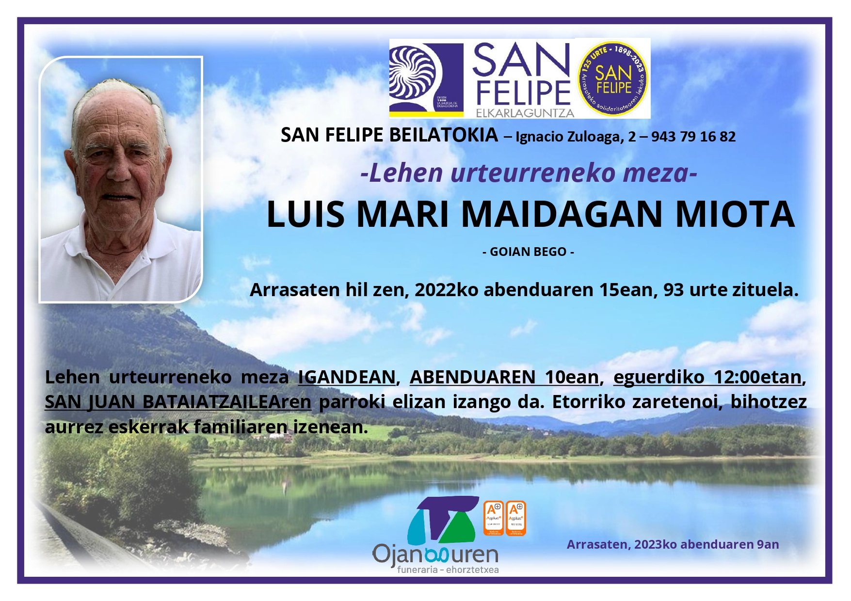 LUIS MARI MAIDAGAN MIOTA -GOIAN BEGO- Arrasaten hil zen, 2022ko abenduaren 15ean, 93 urte zituela. Bere oroimenez, azken agurreko hileta-elizkizuna, OSTIRALEAN, ABENDUAREN 16an izango da, arratsaldeko 19:00etan, SAN JUAN BATAIATZAILEAren parroki-elizan. Etorriko zaretenoi, bihotzez aurrez eskerrak familiaren izenean. Oharra: Familiak San Felipe beilatokian (Ignacio Zuloaga, 2) hartuko zaituzte, gaur, OSTEGUNA, 17:00etatik 19:00etara eta OSTIRALEAN, 11:00etatik 13:00etara eta 16:00etatik 18:30era bitartean. Arrasaten, 2022ko abenduaren 15ean