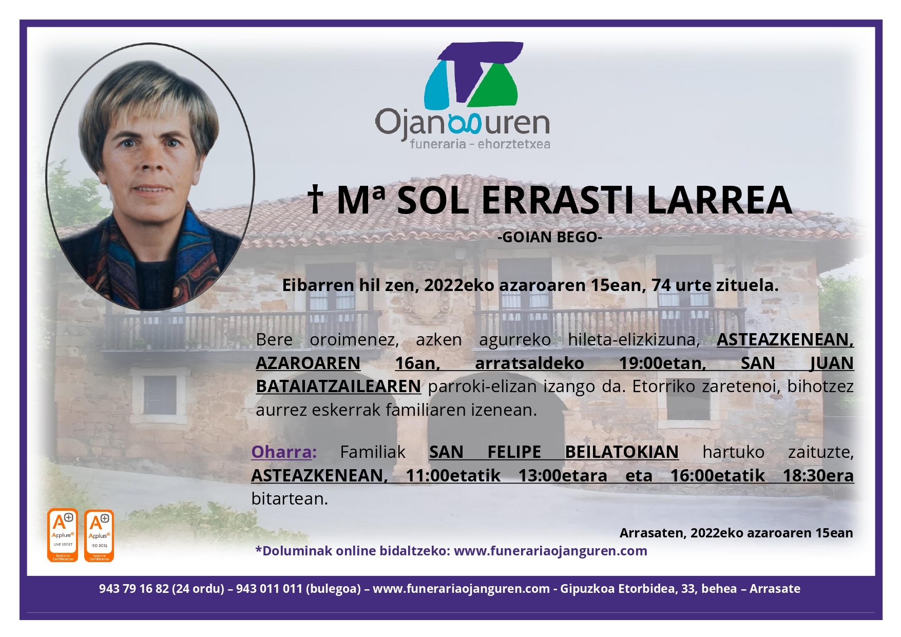 † Mª Sol Errasti Larrea - Goian bego - Atzo, Eibarren hil zen, 74 urte zituela, Elizakoak eta Aita Santuaren Bedeinkapena hartu ondoren. Haren senarra: Juan Biain; anai-arrebak: Lia eta Ramon Zabaleta (†), Beneri (†), Javier (†), Jaime eta Mari Bastida, Ismael eta Joaquina Leibar, Susana (†) eta Manolo Altolaguirre (†), Arantza Aranburu, Jose Mª eta Rosi Balanzategui, Luis Biain (†) eta Mari Carmen Urcelay (†), Roke Biain (†), Jesus Biain eta Mª Antonia Berraondo; ilobak, lehengusu-lehengusinak eta gainerako ahaideak. Haren animaren alde otoitz bat eskatzen dizuete eta arren etor zaiteztela GAUR, ASTEAZKENA, arratsaldeko ZAZPIETAN, San Juan Bataiatzailearen parroki elizan egingo den hiletara. Aldez aurretik mila esker. Mª Solen familiak esker ona adierazi nahi die Eibar ospitaleko lantalde osoari, jasotako arreta eta maitasun guztiagatik. ARRASATEN, 2022ko azaroaren 16an Oharra: Familiak San Felipe beilatokian (Ignacio Zuloaga,2) hartuko zaituzte, gaur, asteazkena, 11:00etatik 13:00etara eta 16:00etatik 18:30era bitartean.