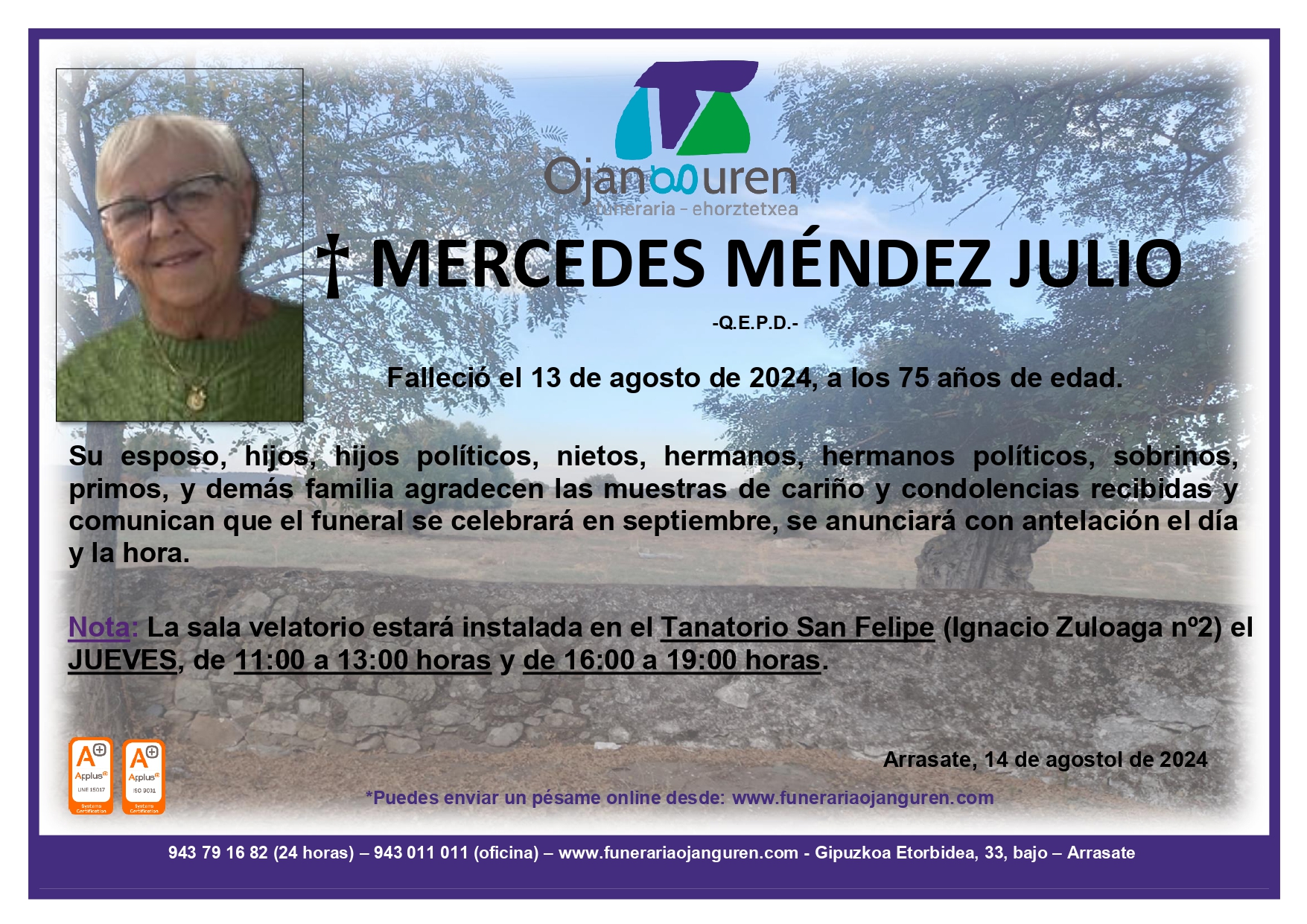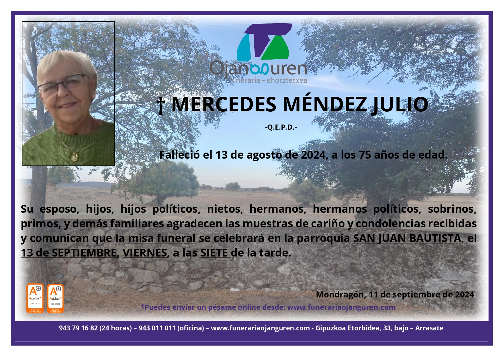 † Mercedes Méndez Julio - Q.E.P.D. - Falleció el 13 de agosto del 2024, a los 75 años de edad. Su esposo, hijos, hijos políticos, nietos, hermanos, hermanos políticos, sobrinos, primos, y demás familiares agradecen las muestras de cariño y condolencias recibidas y comunican que la misa funeral se celebrará en la parroquia de SAN JUAN BAUTISTA, el 13 de SEPTIEMBRE, VIERNES, a las SIETE de la tarde. MONDRAGÓN, 13 de septiembre de 2024
