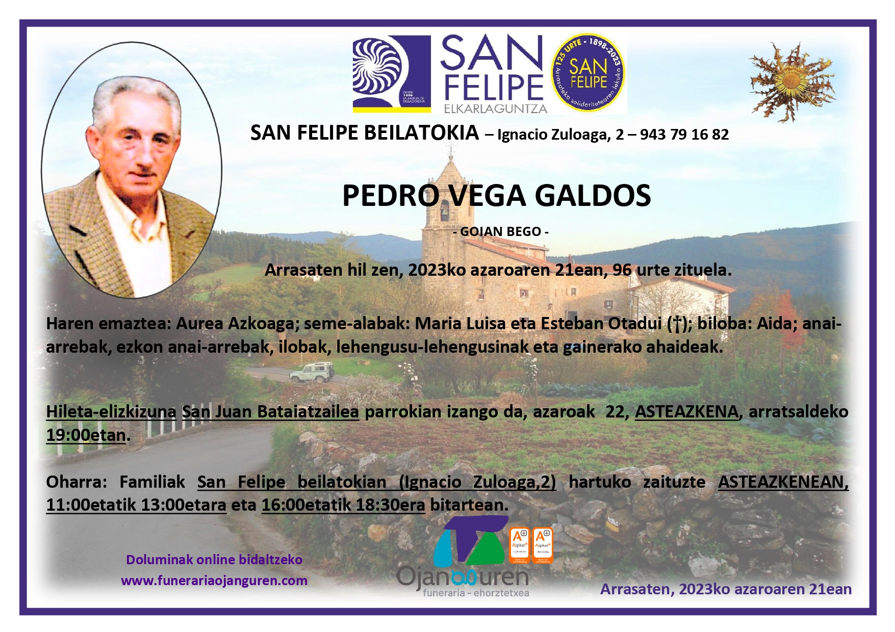 PEDRO VEGA GALDOS -GOIAN BEGO- Arrasaten hil zen, 2023ko azaroaren 21ean, 96 urte zituela. Haren emaztea: Aurea Azkoaga; seme-alabak: Maria Luisa eta Esteban Otadui (†); biloba: Aida; anai-arrebak, ezkon anai-arrebak, ilobak, lehengusu-lehengusinak eta gainerako ahaideak. Hileta-elizkizuna San Juan Bataiatzailea parrokian izango da, azaroak 22, ASTEAZKENA, arratsaldeko 19:00etan. Oharra: Familiak San Felipe beilatokian (Ignacio Zuloaga,2) hartuko zaituzte ASTEAZKENEAN, 11:00etatik 13:00etara eta 16:00etatik 18:30era bitartean. Arrasaten, 2023ko azaroaren 21ean