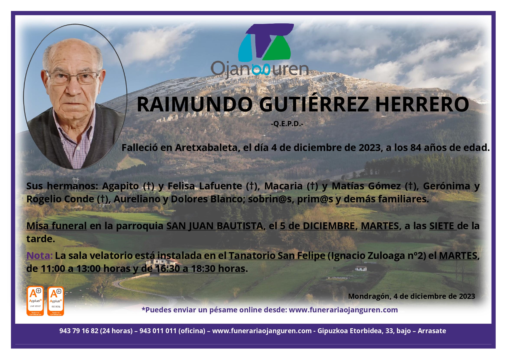 Raimundo Gutiérrez Herrero - Q.E.P.D. - Falleció ayer, en Aretxabaleta, a los 84 años de edad, después de recibir los Santos Sacramentos y la Bendición Apostólica de Su Santidad. Sus hermanos: Agapito (†) y Felisa Lafuente (†), Macaria (†) y Matías Gómez (†), Gerónima y Rogelio Conde (†), Aureliano y Dolores Blanco; sobrin@s, prim@s y demás familiares. Ruegan a sus amistades encomienden su alma a Dios y asistan a los funerales que se celebrarán HOY, MARTES, a las SIETE de la tarde, en la iglesia parroquial de San Juan Bautista, por todo lo cual les quedarán muy agradecidos. ARRASATE, 5 de diciembre de 2023 Nota: La sala velatorio está instalada en el Tanatorio San Felipe (Ignacio Zuloaga nº2) hoy, MARTES, de 11:00 a 13:00 horas y de 16:30 a 18:30 horas.
