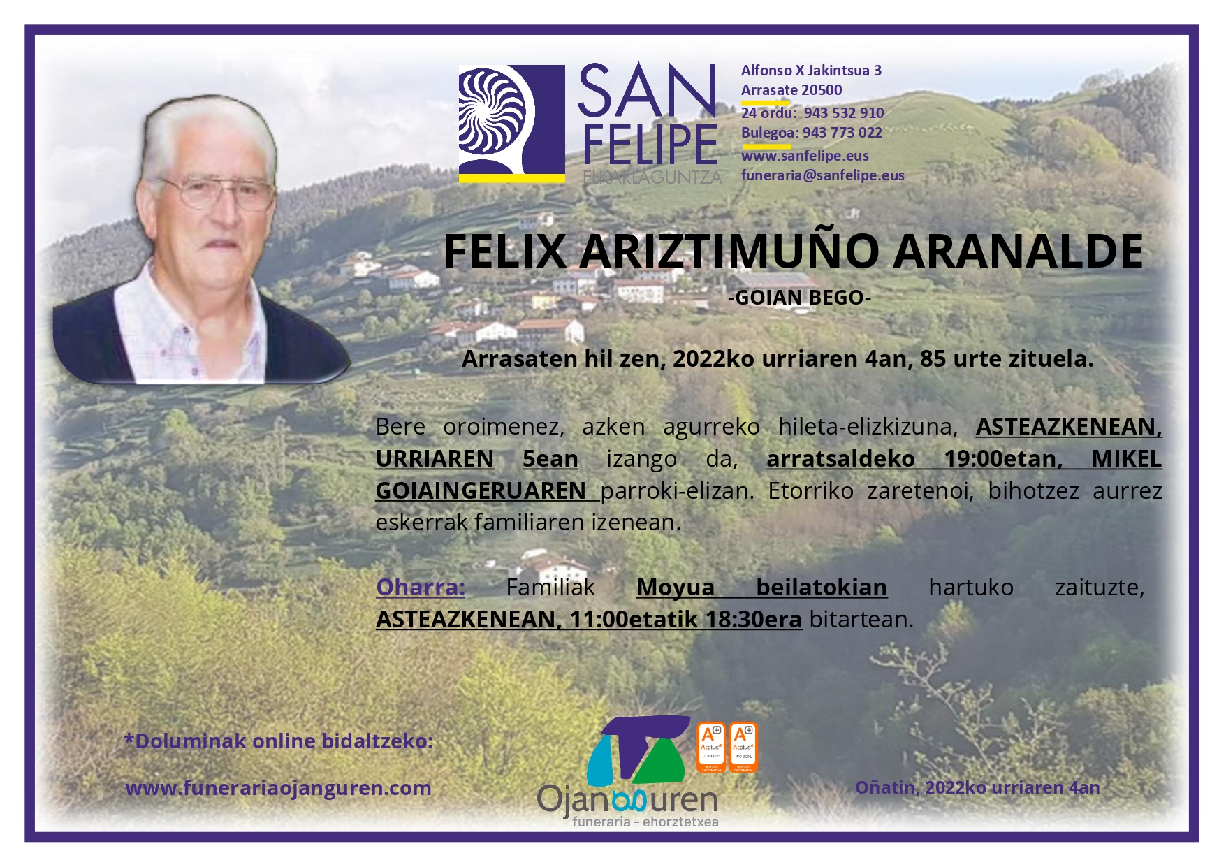 FELIX ARIZTIMUÑO ARANALDE -GOIAN BEGO- Arrasaten hil zen, 2022ko urriaren 4an, 85 urte zituela. Bere oroimenez, azken agurreko hileta-elizkizuna, ASTEAZKENEAN, URRIAREN 5ean izango da, arratsaldeko 19:00etan, MIKEL GOIAINGERUAREN parroki-elizan. Etorriko zaretenoi, bihotzez aurrez eskerrak familiaren izenean. Oharra: Familiak Moyua beilatokian hartuko zaituzte, ASTEAZKENEAN, 11:00etatik 18:30era bitartean. Oñatin, 2022ko urriaren 4an