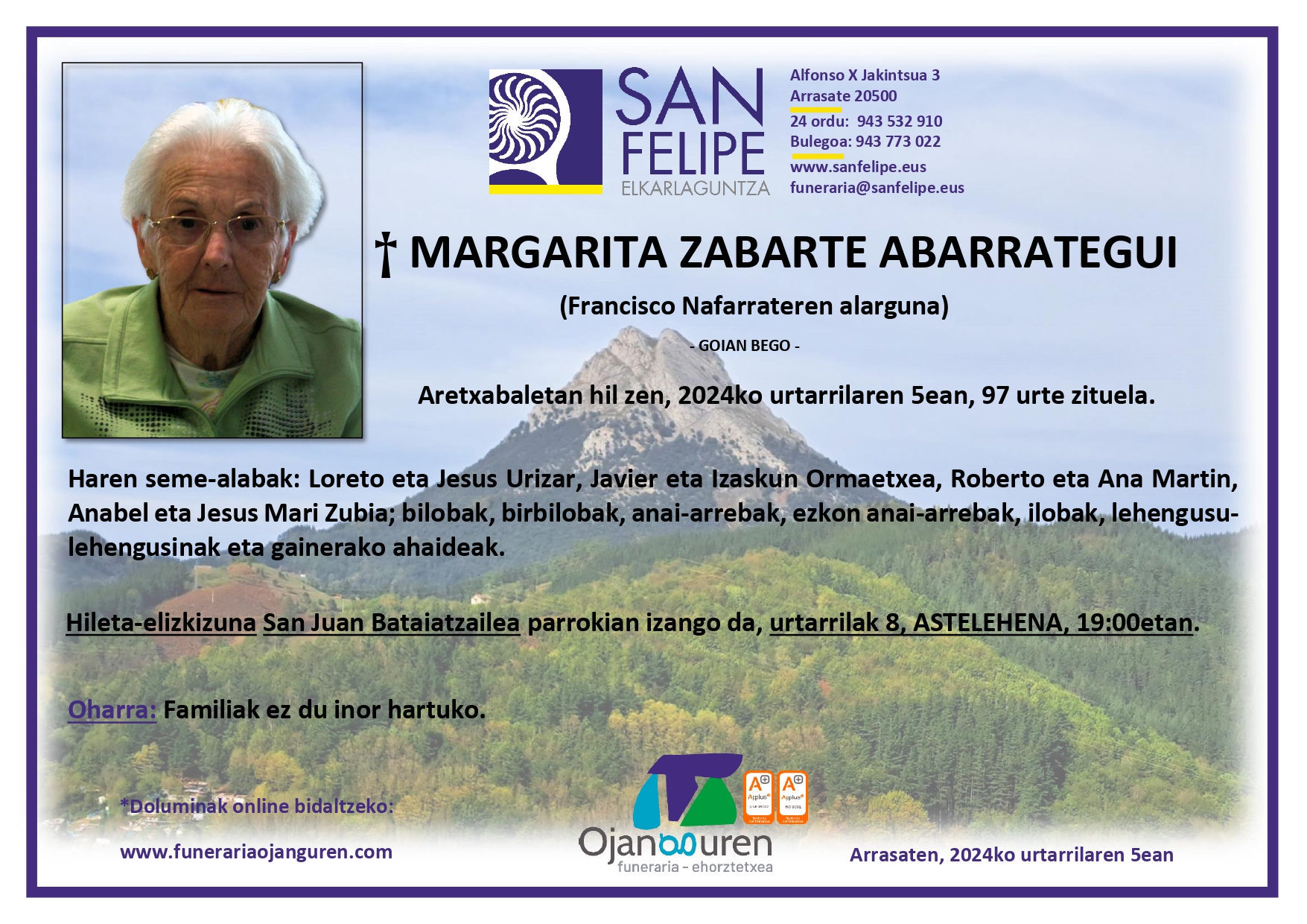 MARGARITA ZABARTE ABARRATEGUI (Francisco Nafarrateren alarguna) – GOIAN BEGO – Aretxabaletan hil zen, 2024ko urtarrilaren 5ean, 97 urte zituela. Haren seme-alabak: Loreto eta Jesus Urizar, Javier eta Izaskun Ormaetxea, Roberto eta Ana Martin, Anabel eta Jesus Mari Zubia; bilobak, birbilobak, anai-arrebak, ezkon anai-arrebak, ilobak, lehengusu-lehengusinak eta gainerako ahaideak. Hileta-elizkizuna San Juan Bataiatzailea parrokian izango da, urtarrilak 8, ASTELEHENA, 19:00etan. Oharra: Familiak ez du inor hartuko. Arrasaten, 2024ko urtarrilaren 5ean