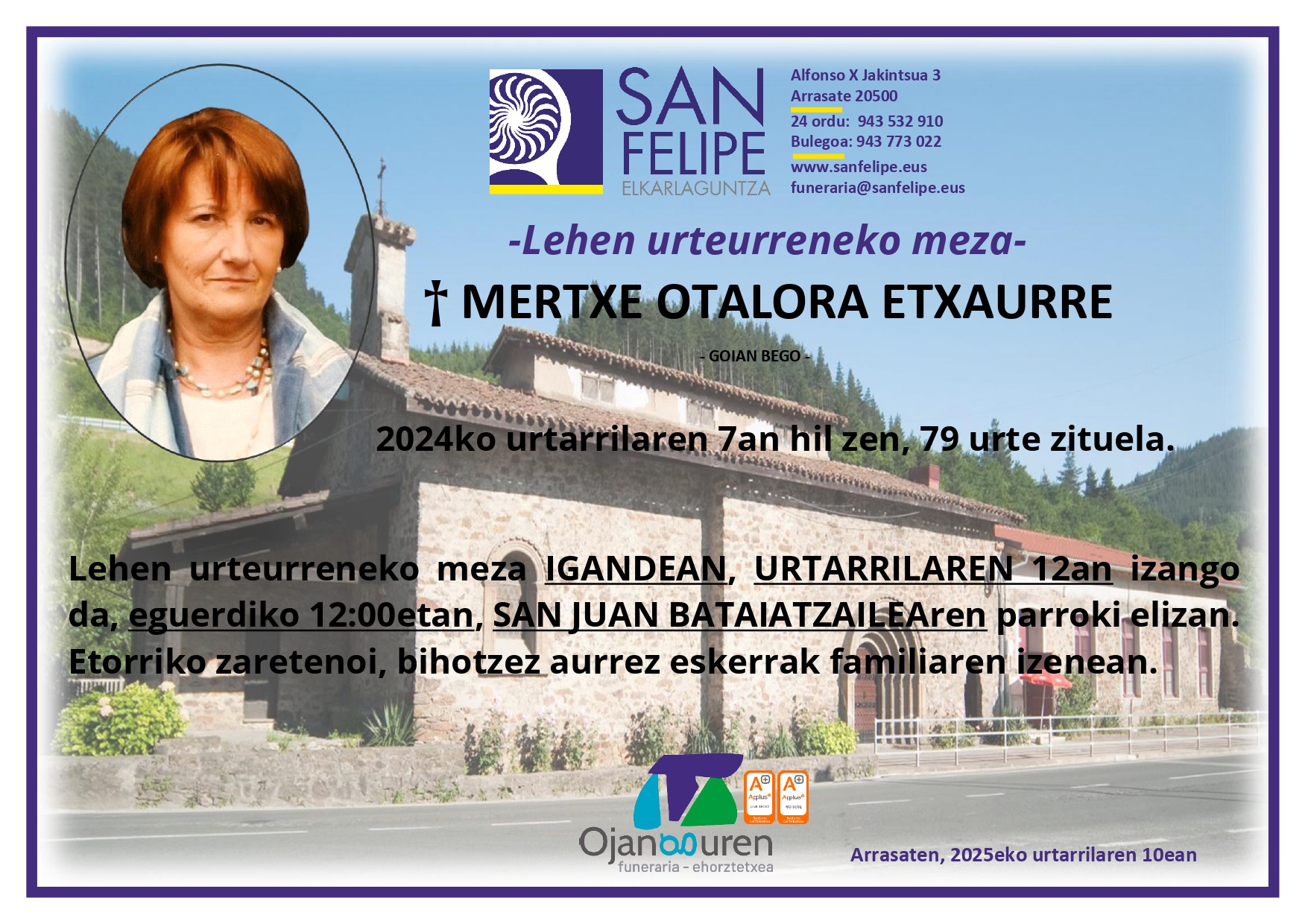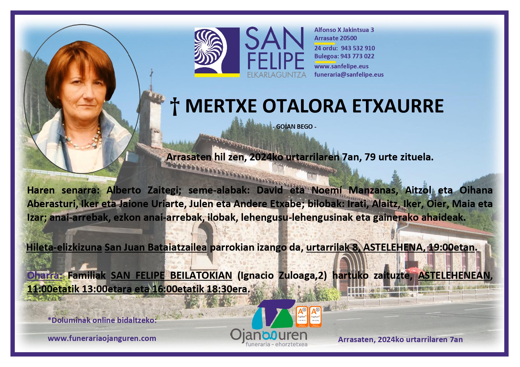 MERTXE OTALORA ETXAURRE -GOIAN BEGO- Arrasaten hil zen, 2024ko urtarrilaren 7an, 79 urte zituela. Haren senarra: Alberto Zaitegi; seme-alabak: David eta Noemí Manzanas, Aitzol eta Oihana Aberasturi, Iker eta Jaione Uriarte, Julen eta Andere Etxabe; bilobak: Irati, Alaitz, Iker, Oier, Maia eta Izar; anai-arrebak, ezkon anai-arrebak, ilobak, lehengusu-lehengusinak eta gainerako ahaideak. Hileta-elizkizuna San Juan Bataiatzailea parrokian izango da, urtarrilak 8, ASTELEHENA, 19:00etan. Oharra: Familiak SAN FELIPE BEILATOKIAN (Ignacio Zuloaga,2) hartuko zaituzte, ASTELEHENEAN, 11:00etatik 13:00etara eta 16:00etatik 18:30era. Arrasaten, 2024ko urtarrilaren 7an